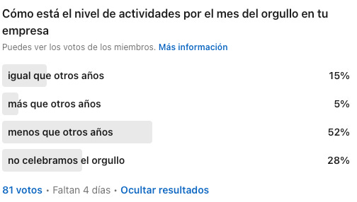 Lancé la pregunta en mi comunidad de Linkedin para ver cómo están viviendo este mes del Orgullo, y aunque no se trata de una muestra representativa, creo que refleja una tendencia que merece la pena observar (y que preocupa!)